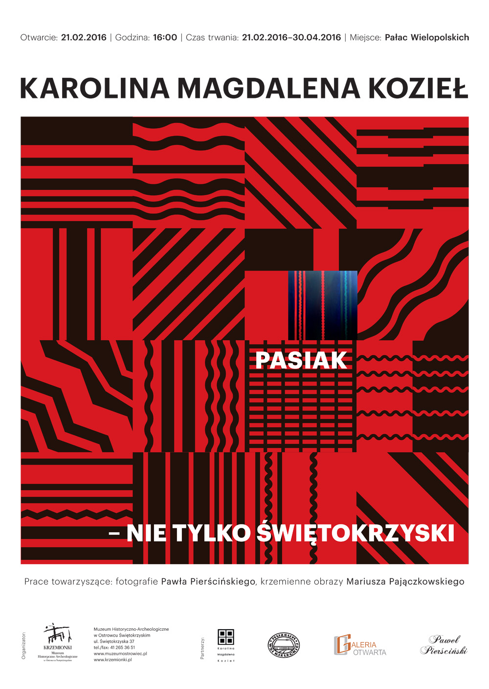 „Pasiak nie tylko świętokrzyski” – taki tytuł ma wystawa prac Karoliny Magdaleny Kozieł, w której skład wchodzą obrazy w technice olejnej oraz fotograficzne cykle inspirowane regionalnym motywem pasiaka świętokrzyskiego. Źródło inspiracji zaczerpnięte z historii regionu świętokrzyskiego, zinterpretowane i przekształcone na potrzeby obrazu, tworzy nowe, awangardowe spojrzenie.