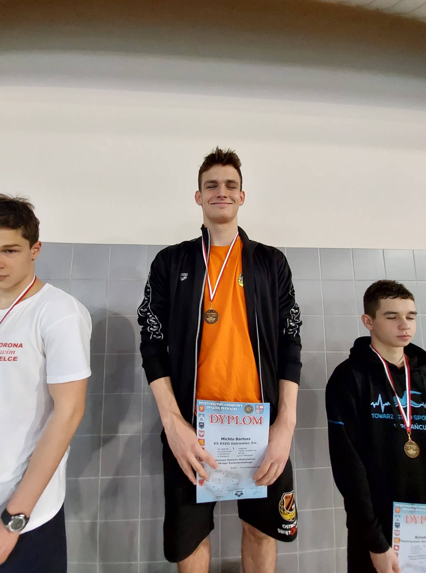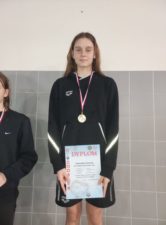 Ponad 100 medali, w tym 43 złote, przywieźli uczniowie SMS Ostrowiec z Zimowych Otwartych Mistrzostw Okręgu Świętokrzyskiego, które rozgrywane były w dn. 13-14.11.2021 w Kielcach. Nasi uczniowie reprezentowali głównie klub KSZO Ostrowiec, ale także UKS 51 Lublin. Najwyżej w grupie multimedalistów znaleźli się Zuzanna Kamińska (15 medali, w tym 11 złotych, 2 srebrne i 2 brązowe), Bartosz Michta (13 medali, w tym 10 złotych i 3 srebrne) oraz Filip Suchański (10 medali, w tym 7 złotych, 2 srebrne, 1 brązowy). Ponadto Zuzia pobiła Rekordy Okręgu Świętokrzyskiego Juniorów 16-lat i 15-lat na dystansie 100 m stylem zmiennym.
